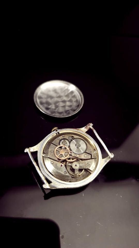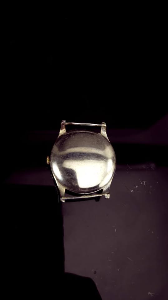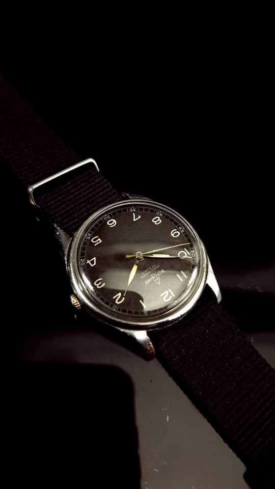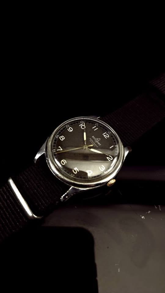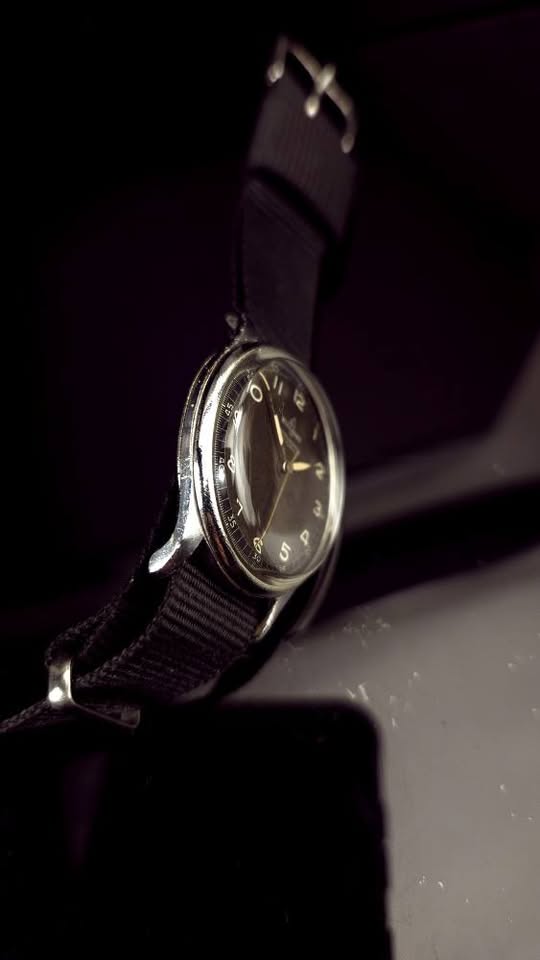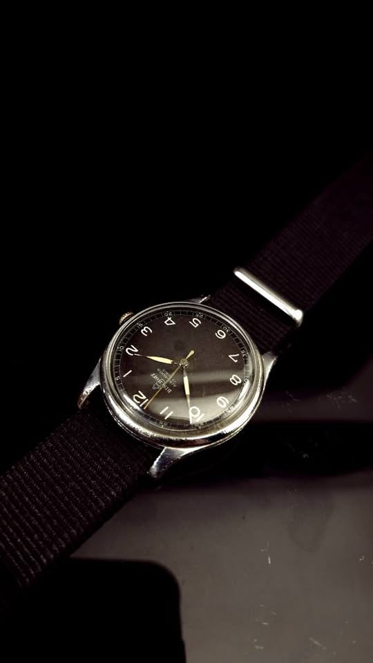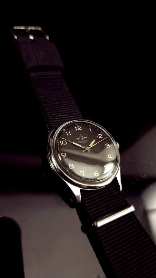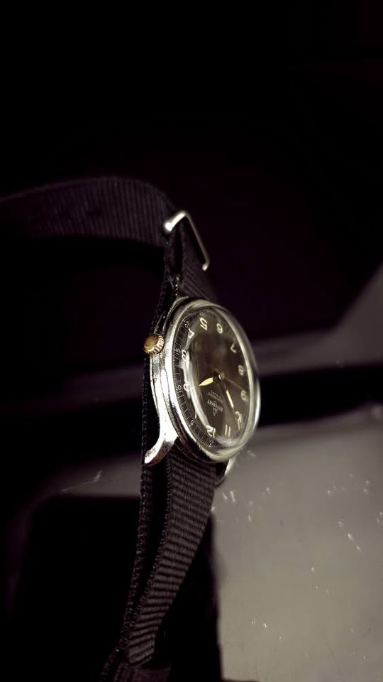 Ceas de mână elvețian de tip militar Bischoff Aero-Anker, fabricat în anii '40, frumos păstrat. Cadran negru ușor patinat, indecși pictați cu fosfor, indicatoare argintii cu marcaje din fosfor, registru periferic de secunde și înscrisuri albe. Geam impecabil, carcasă patinată prin purtare, capac spate din oțel, anse fixe. Mecanism ETA/Eterna calibrul 096 cu 17 rubine, balans compensat și punte suplimentară pentru secundar central, în stare bună de funcționare. Însoțit de curea din pânză tip NATO nouă. Diametrul 33 mm fără coroniță. Preț 680 lei.