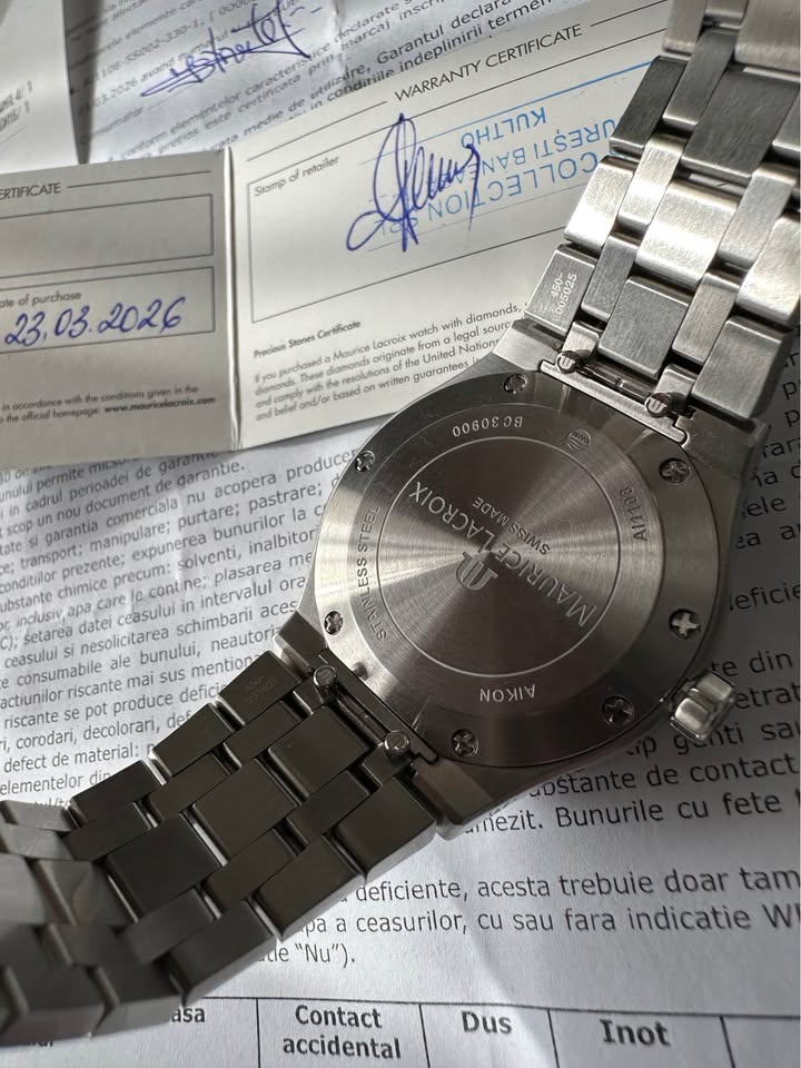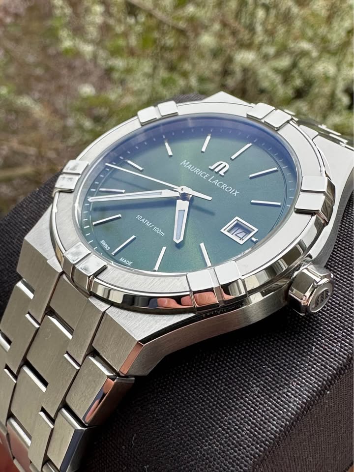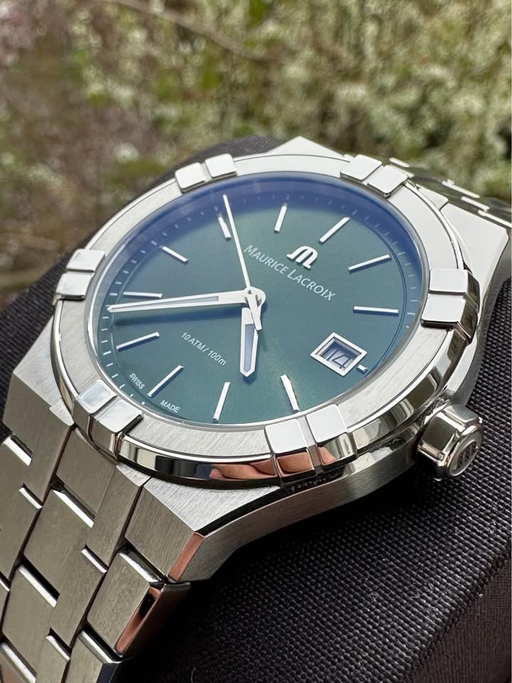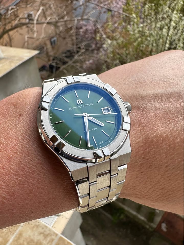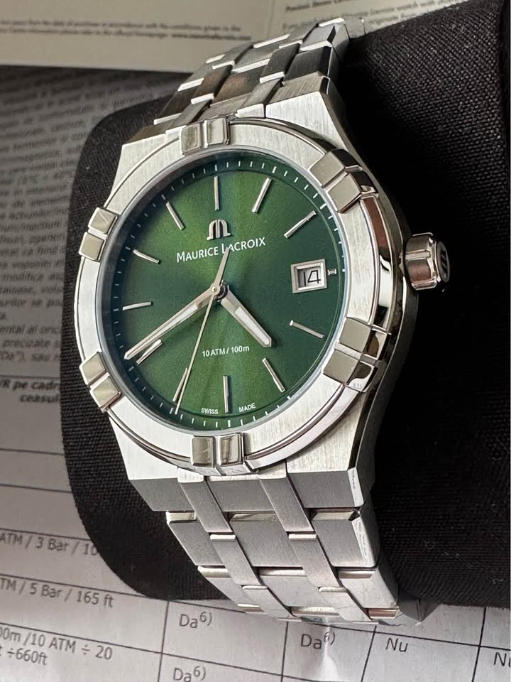 Vând ceas Nou, Maurice Lacroix Aikon Quartz, carcasă de oțel cu diametrul de 40mm, înălțimea carcasei 10mm, geam safir cristal antireflex, data la ora 3, cadran verde, superb, cheiță pe filet, mecanism quartz Swiss Made, rezistență la apă 100M, brățara completă, însoțit de cutie, supracutie, card, factură. Ceasul este Nou, în garanție până în martie 2028. Preț fix 3300 lei.