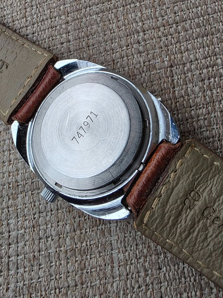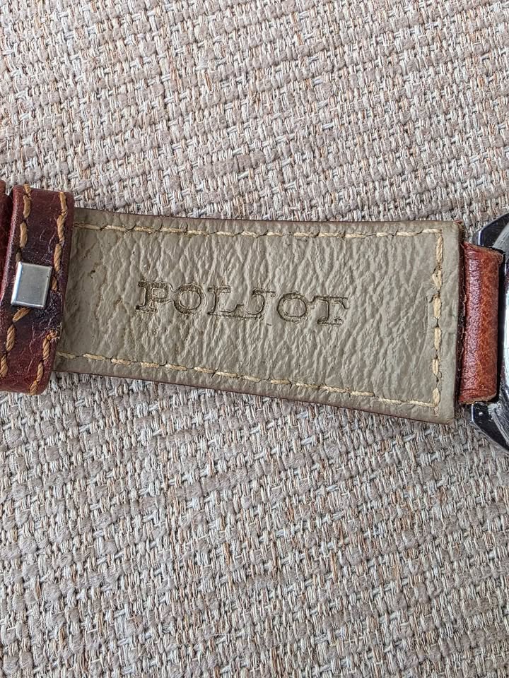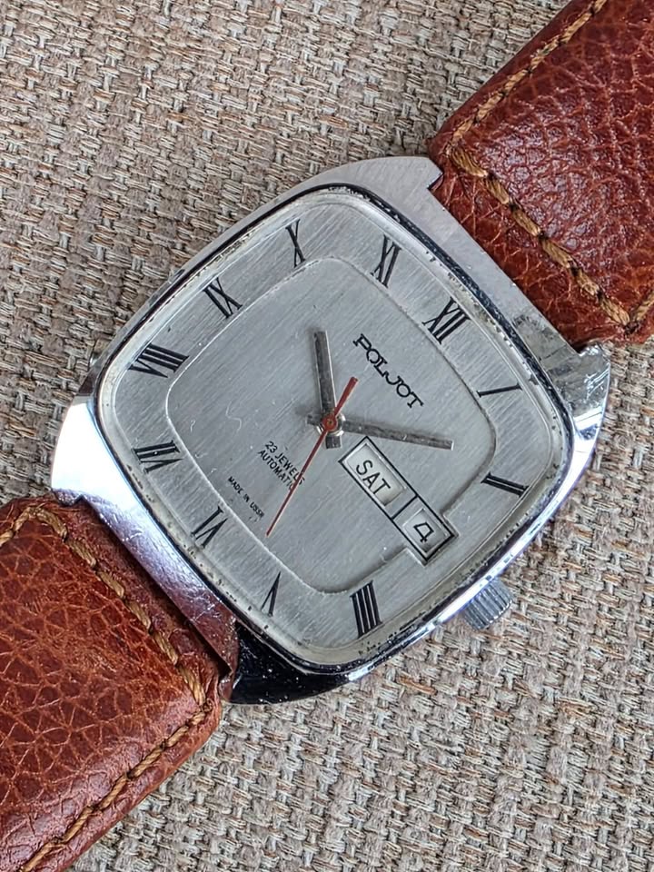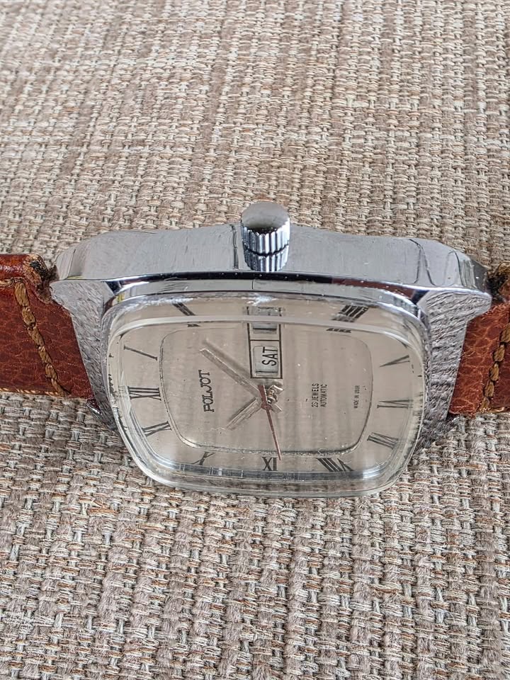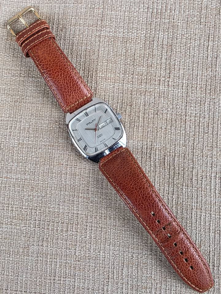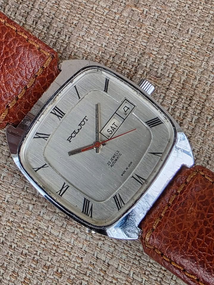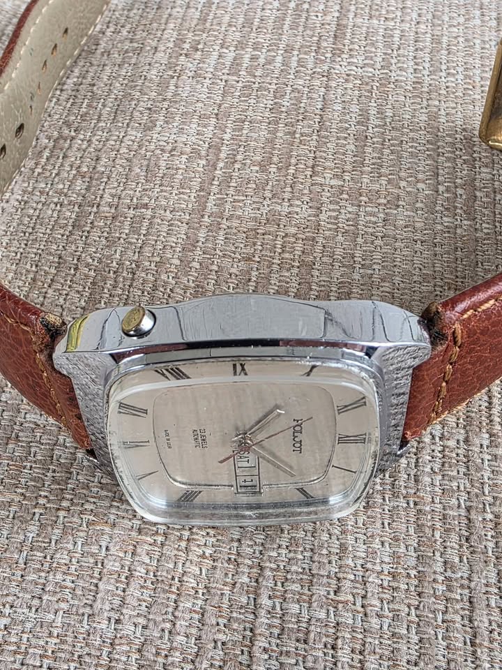De vânzare ceas automatic Poljot, mecanism cu 23 de rubine, functionare foarte bună, dată dublă funcțională cu buton de setare rapidă a datei poziționat în dreptul orei 8, geam acrilic original în stare bună, lățimea carcasei 35 mm măsurat față coroniță, curea originală Poljot cu logo inclusiv pe catară, preț fix 450 lei + transport. Ofer factură + garanție 6 luni. Nu sunt interesat de schimburi sau de alte oferte. Postat în mai multe locuri.
