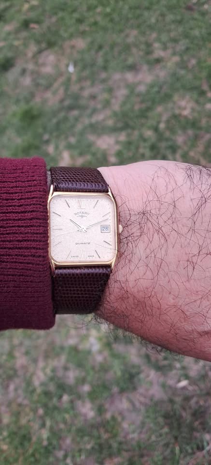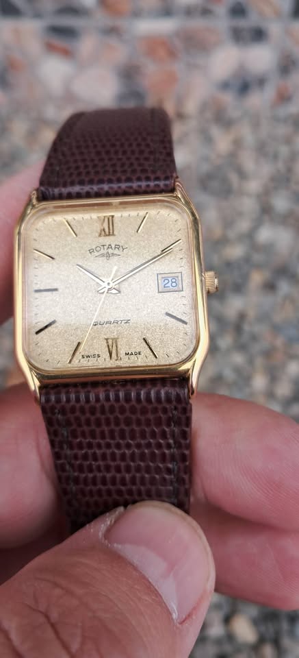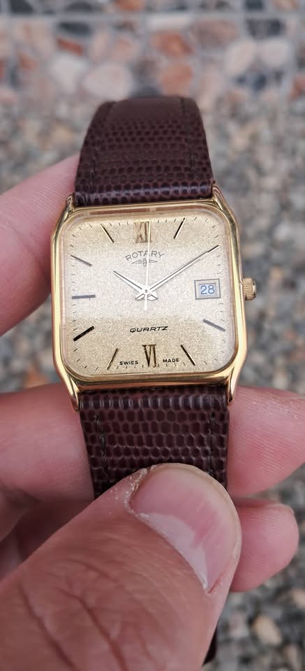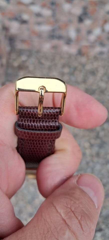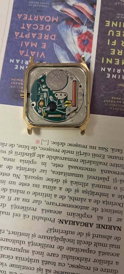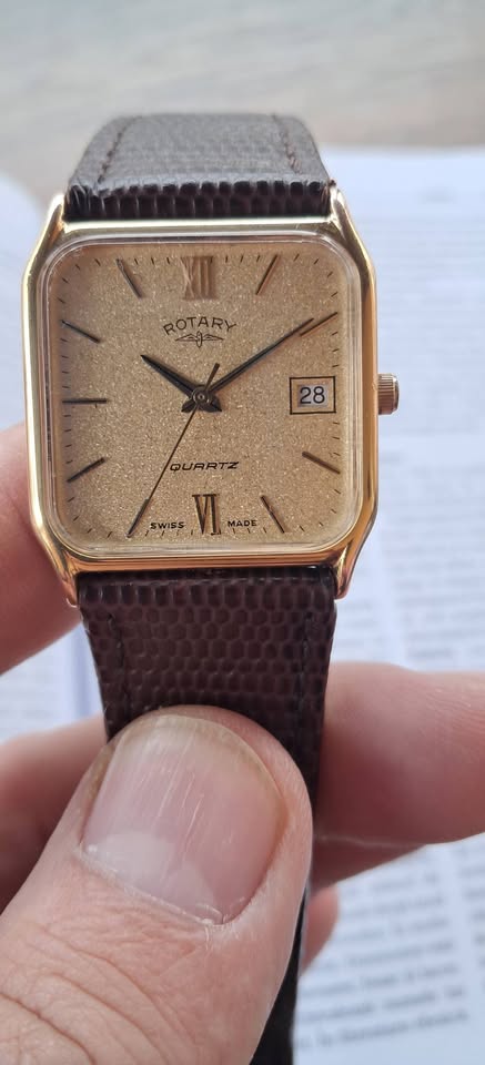 Model anii 90, patrat, carcasa placata cu aur. Diametru 30 pe 32 mm, masculin dar se preteaza si unisex. Mecanism ETA Swiss precis. Cadran auriu mozaic, nuante patinate. Foarte placut la privit din pricina stralucirii. Design tank vintage. Ace cu dunga neagra pentru vizibilitate rapida, indecsi in relief, data rapida. Crystal acrylic fara uzura, mai avantajos decat mineral deoarece se poate polisha. Curea piele calitate mm la anse tip sopirla. Baterie noua, bine intretinut. Pret 650 lei.